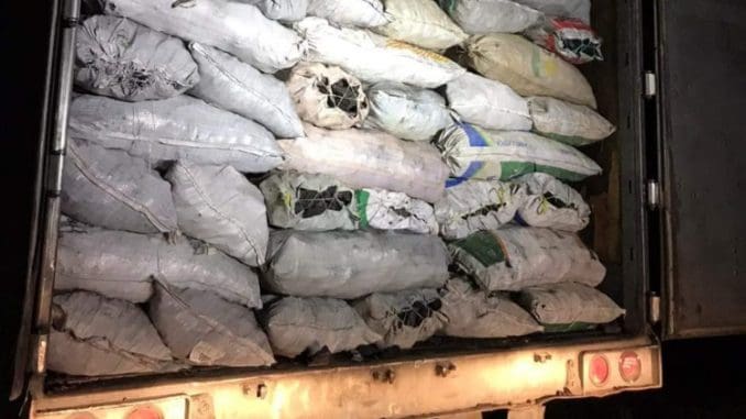Luego de marcar el alto al conductor de la pesada unidad, procedieron a la revisión del interior del remolque y descubrieron la carga, que consistía en mil 100 costales de carbón vegetal.