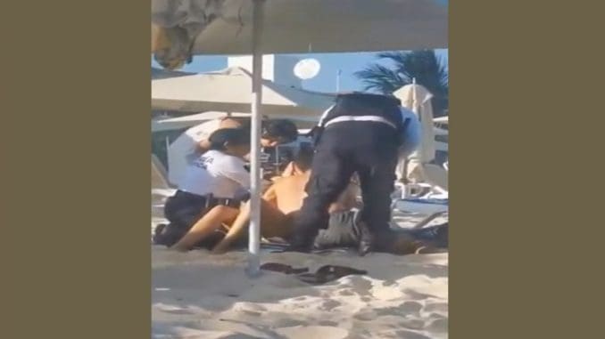 Según el vídeo que circula en redes, personal de la policía turística en una playa cerca de la calle 28, desalojaba con el uso de la fuerza a unos turistas, aparentemente de nacionalidad mexicana, que estaban sentados en la zona de Playa Mamitas.