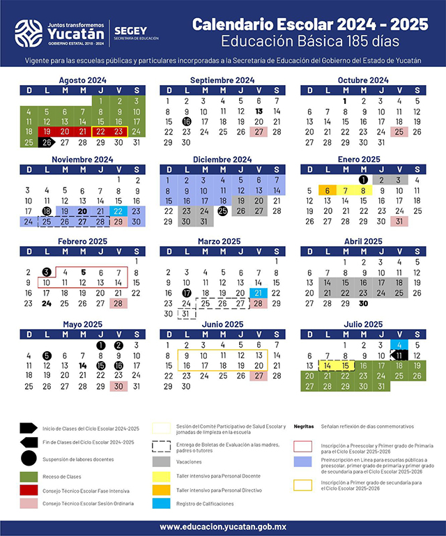 Mérida, a 13 de julio de 2024.-La Secretaría de Educación de Yucatán (Segey) anunció el calendario escolar 2024-2025, el cual contabiliza 185 días.