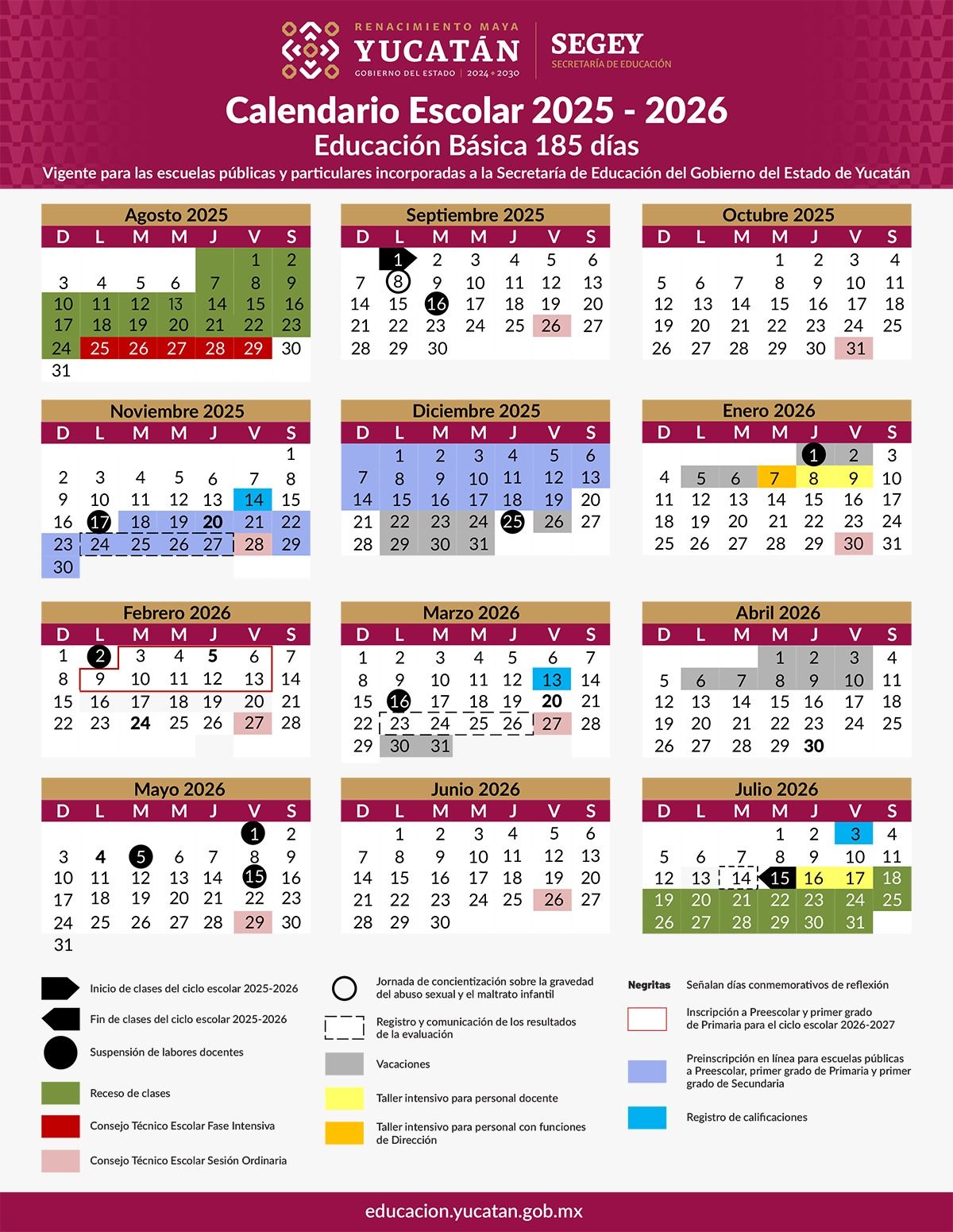 El Calendario Escolar 2025–2026 puede consultarse y descargarse a través del sitio web oficial educacion.yucatan.gob.mx.