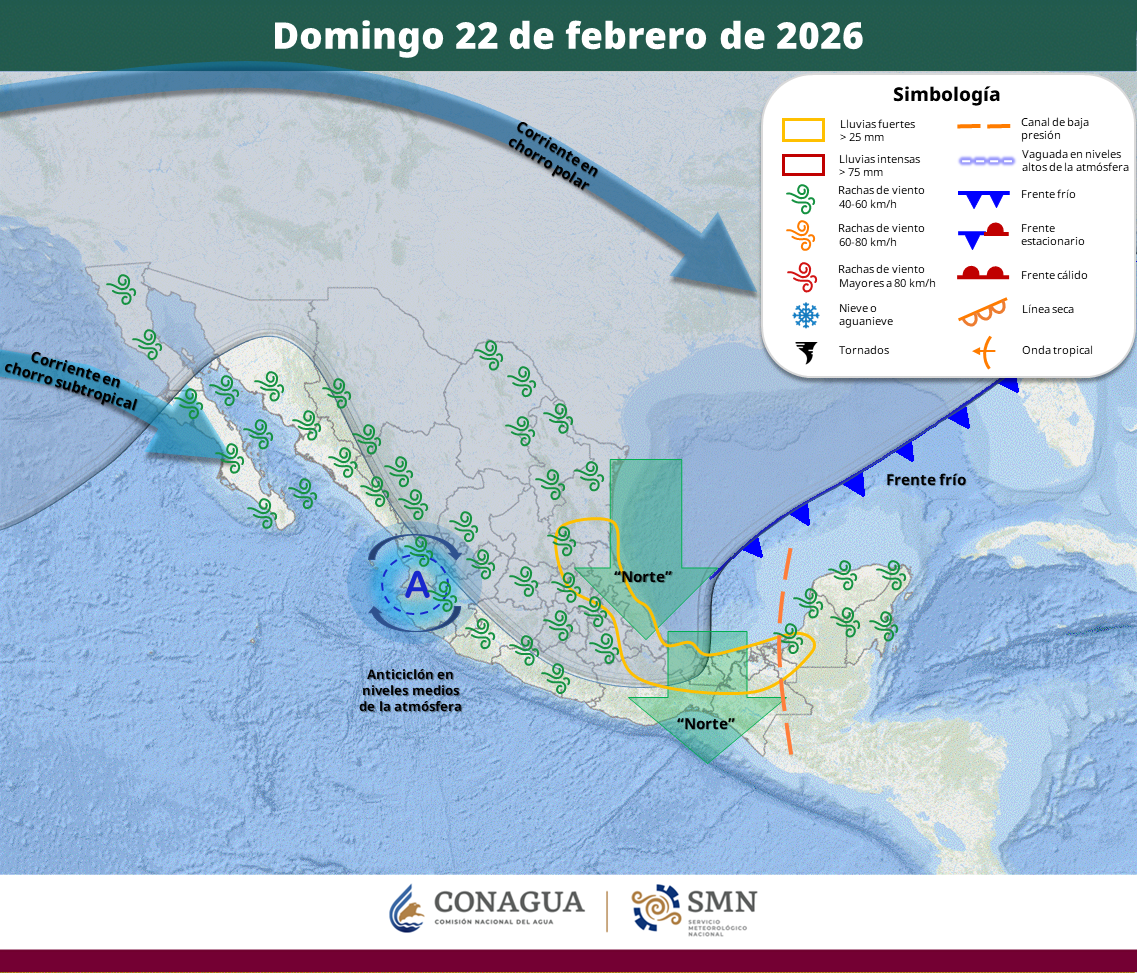 Por otra parte, Procivy indicó que se mantiene el pronóstico del ingreso de un nuevo frente frío a la Península de Yucatán, el cual provocará un «norte» fuerte con rachas de viento de hasta 75 kph en la zona costera y de 50 kph en el resto del estado.