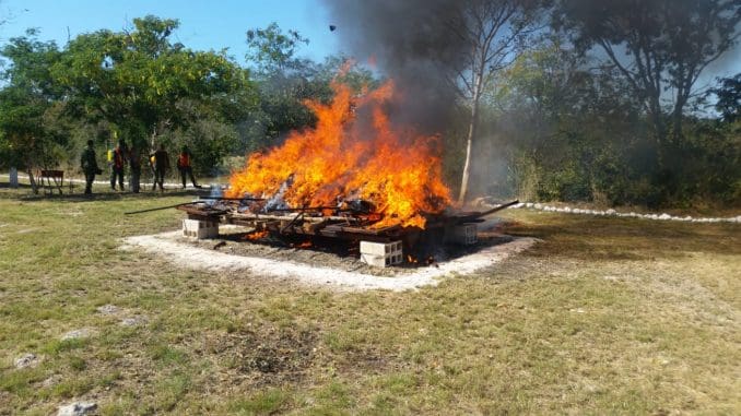 Mérida, Yucatán, 23 de enero de 2020.- Cerca de 200 kilogramos de enervantes, producto de 30 aseguramientos diferentes, fueron incinerados esta mañana en el Campo Militar No. 32-A ante la presencia de autoridades civiles y castrenses.