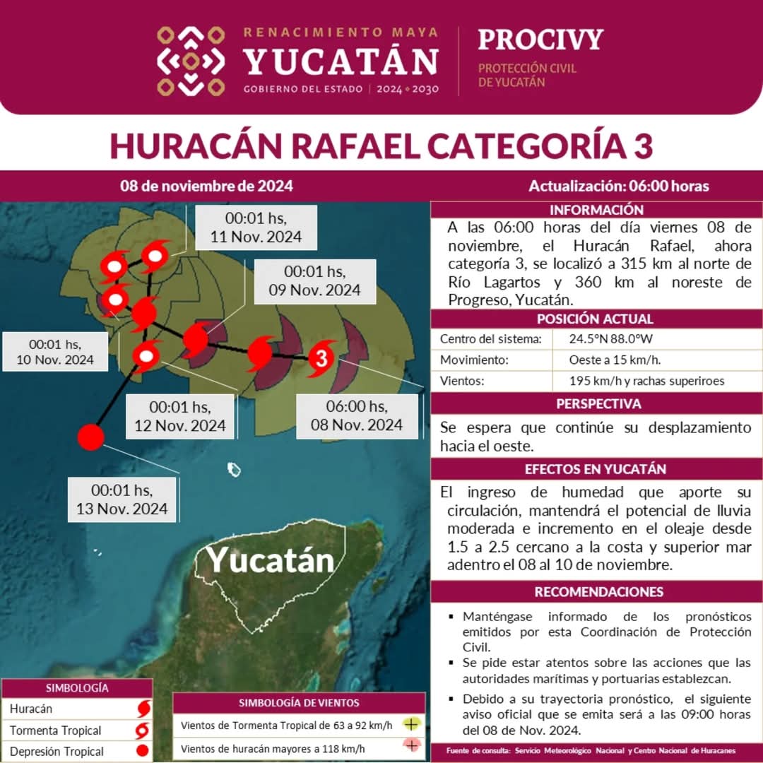 Mérida, a 8 de noviembre de 2024.- Durante la madrugada de este viernes, el huracán Rafael se intensificó a categoría 3, por lo que el Centro Nacional de Huracanes (CNH) señaló en su pronóstico que el meteoro avanza hacia el oeste.