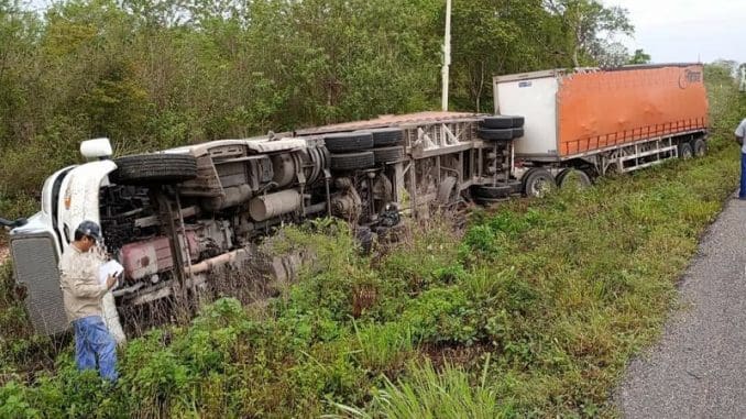 Mérida, Yucatán, 5 de julio del 2023.-Un tráiler que jalaba dos remolques cargados con cervezas volcó sobre la carretera Mérida-Cancún, a la altura de Kantunil, y personas que pasaban por ahí aprovecharon y se llevaron todo el producto que pudieron.