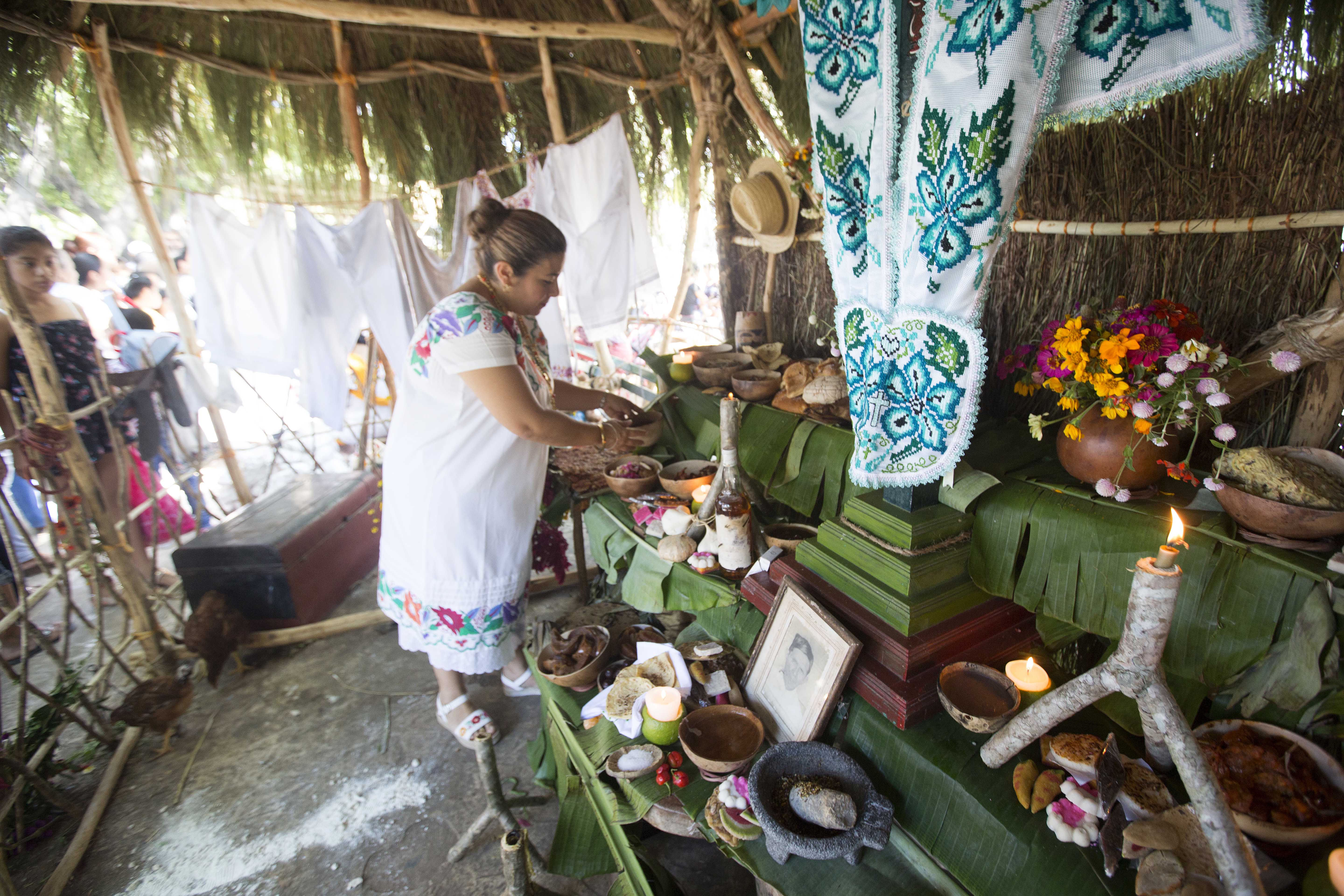 Desde el día de ayer los expositores comenzaron a montar las estructuras de paja y huano. Esta mañana, a temprana hora, acomodaron mesas, manteles y velas, depositaron los mucbipollos, chocolate, mazapanes, dulces de camote, cigarros y hasta botellas de tequila frente a las fotografías de los difuntos y antes de las 9 horas dieron los toques finales a sus altares: coloraron ofrendas florales, encendieron las velas y en algunos casos, iniciaron la preparación de las tortillas en comales improvisados.