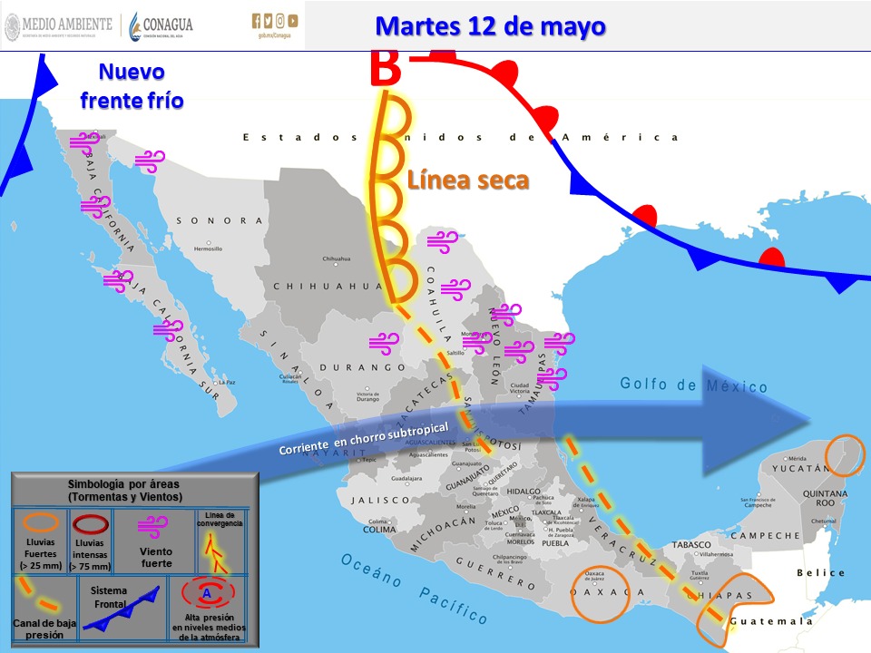 En el resto de la entidad se esperan tormentas dispersas, así como temperaturas máximas de 35 grados y vientos del Este-Noreste 50 kilómetros por hora con rachas fuertes en la zona costera.