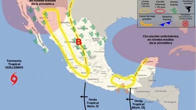 La dependencia señala que el desplazamiento de la onda tropical No. 13 y una vaguada profunda sobre el sur de la península mantendrán la probabilidad de precipitaciones fuertes al noreste, centro y noroeste de Yucatán, sur y centro de Campeche, así como en el sur y centro de Quintana Roo.
