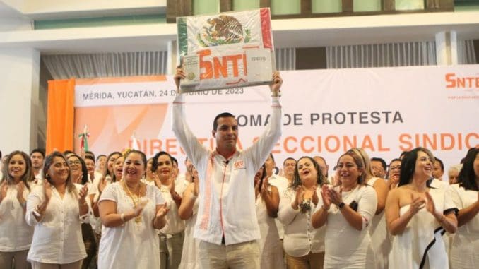 Mérida, Yucatán, a 24 de junio de 2023.- Este sábado, el maestro Emmanuel González Chávez, rindió protesta como nuevo dirigente de la Sección 33 del Sindicato Nacional de Trabajadores de Yucatán (SNTE), la cual cuenta con más de 21 mil afiliados, entre maestros, administrativos y manuales.