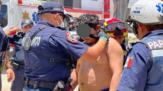 Mérida, Yucatán, 27 de junio del 2023.-Bomberos y paramédicos de la Secretaría de Seguridad Pública (SSP) rescataron a un hombre que cayó accidentalmente a un pozo pluvial seco en el Centro de Mérida.