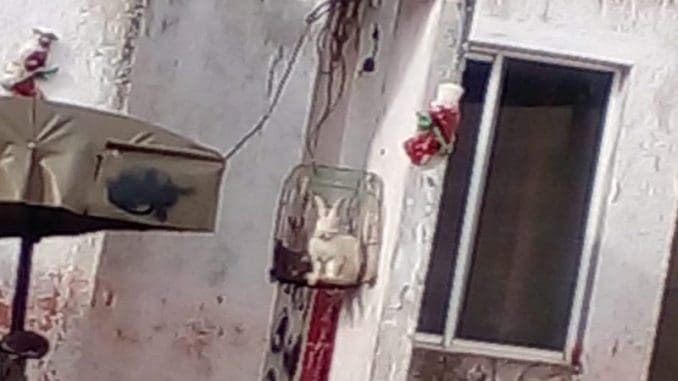 De acuerdo con una imagen compartida en redes sociales, se observa que el conejo permanecía encerrado en una jaula para pájaros colgada de una pared, con nulo espacio para poder siquiera caminar. No se informó en qué condiciones estaba el perrito.