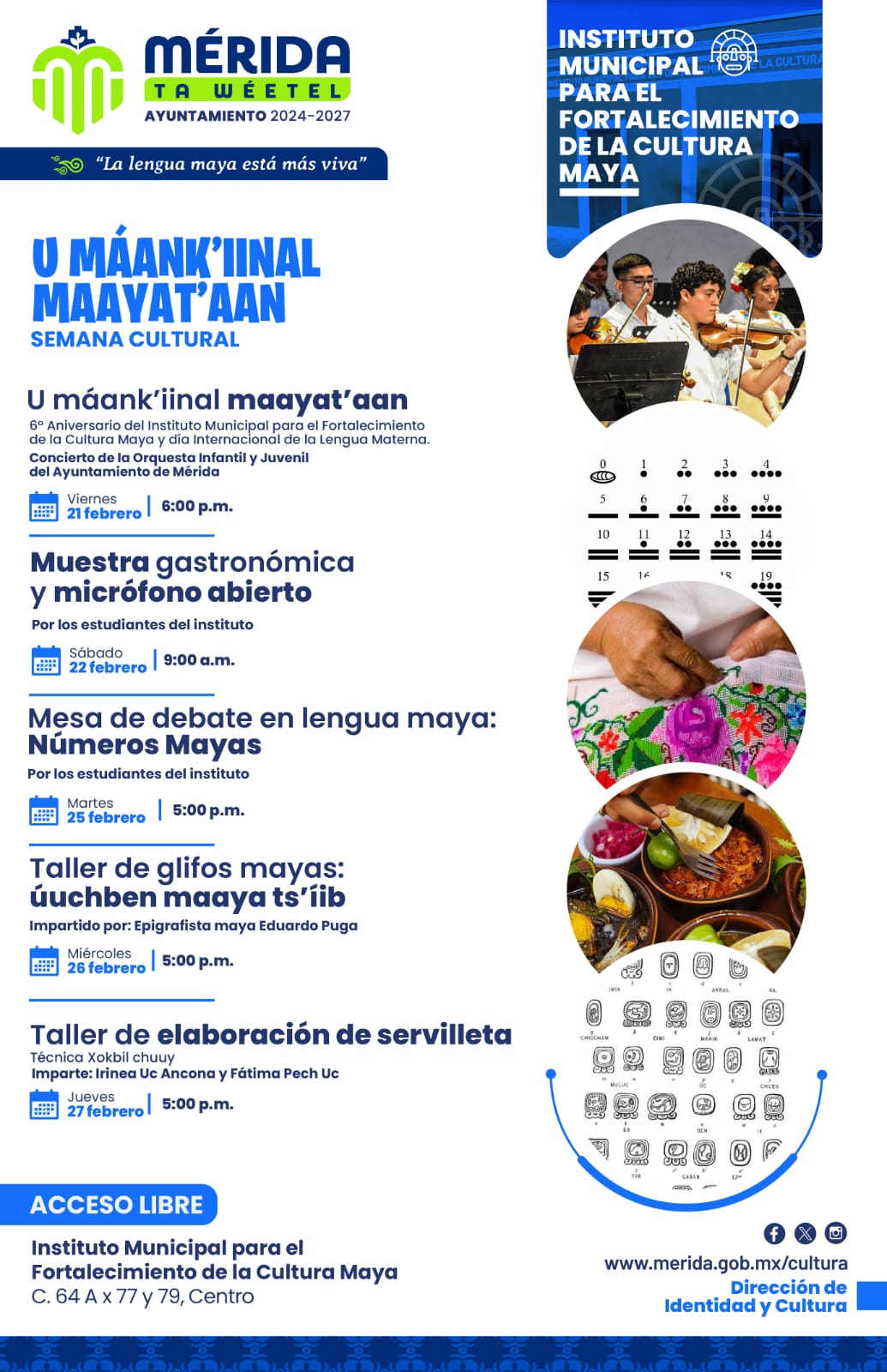 Mérida, a 21 de febrero de 2025.- Con un programa artístico, talleres, muestra gastronómica y música, el Instituto Municipal para el Fortalecimiento de la Cultura Maya celebrará su sexto aniversario como una institución que revitaliza a través de diversas acciones para promover la lengua materna.