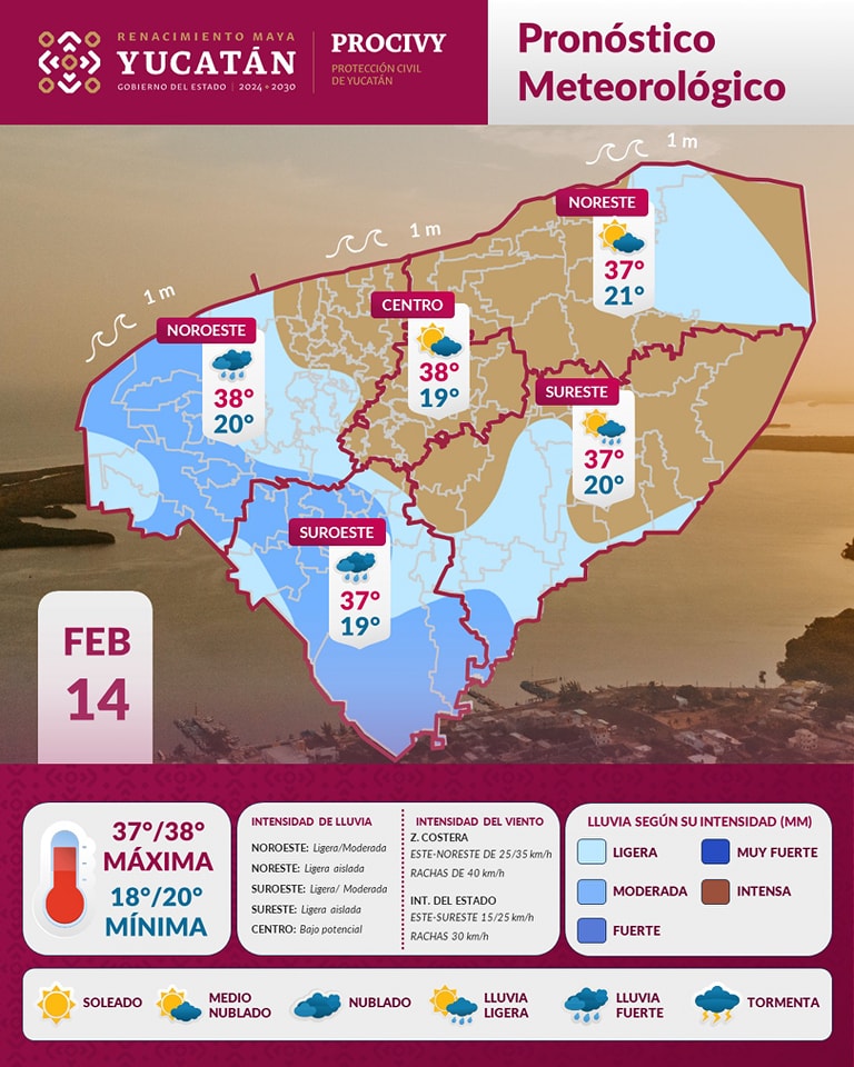 Protección Civil de Yucatán (PROCIVY) informó que este viernes, el ingreso de humedad proveniente del Mar Caribe y el establecimiento de una vaguada, favorecerá la presencia de lluvia ligera con chubascos dispersos por la tarde e inicios de la noche en los municipios del suroeste y noroeste del estado de #Yucatán.