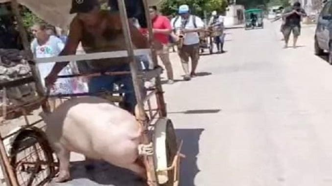 San Fco. Campeche, Campeche, 27 de julio del 2023.-Durante una procesión en Hecelchakán, Campeche, un señor transportaba a un cochino en su triciclo, cuando de pronto una señora gritó: ¡hay se va a caer, se va a caer, se cayó el cochino, se cayó!, viralizándose de inmediato.