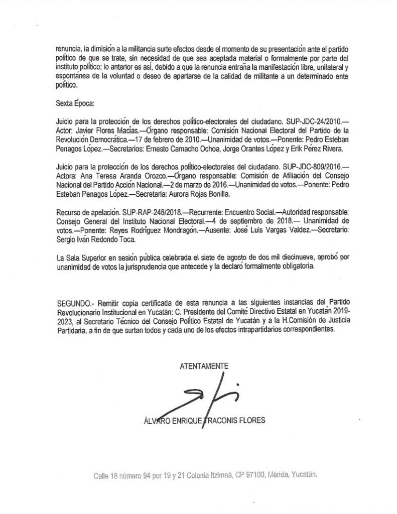 Esto confirma que la renuncia de Ivonne Ortega no es la única oficial, como quiso dar a entender la tarde de ayer Torres Rivas, pues como hemos señalado líneas atrás, desde diciembre pasado Traconis Flores realizó el trámite correspondiente.