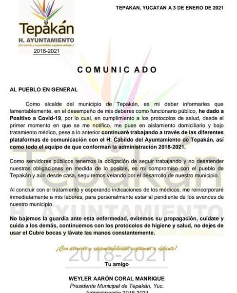 Mérida, Yucatán, 4 de enero de 2021.– A través de la cuenta oficial de Facebook del Ayuntamiento de Tepakán, el alcalde Weyler Aarón Coral Manrique, reveló que resultó positivo a Covid-19, por lo cual desde anoche se aisló en su domicilio desde donde seguirá trabajando con el Cabildo.