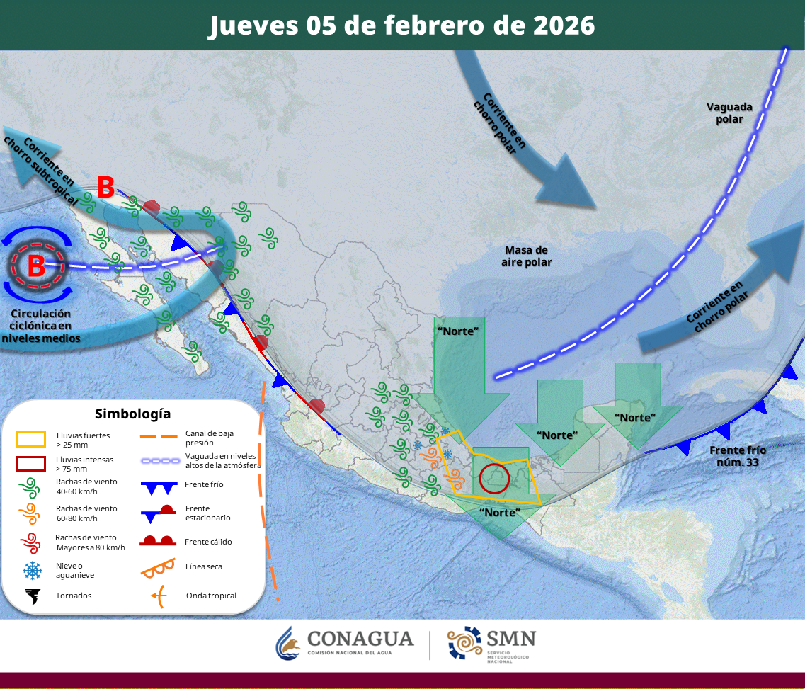 El citado frente frío provocará un “norte” con rachas de viento de 45 a 55 km/h en la zona costera y de 25 a 35 km/h en el resto del estado, oleaje de dos a tres metros de altura y lluvias de ligeras a moderadas durante su desplazamiento.
