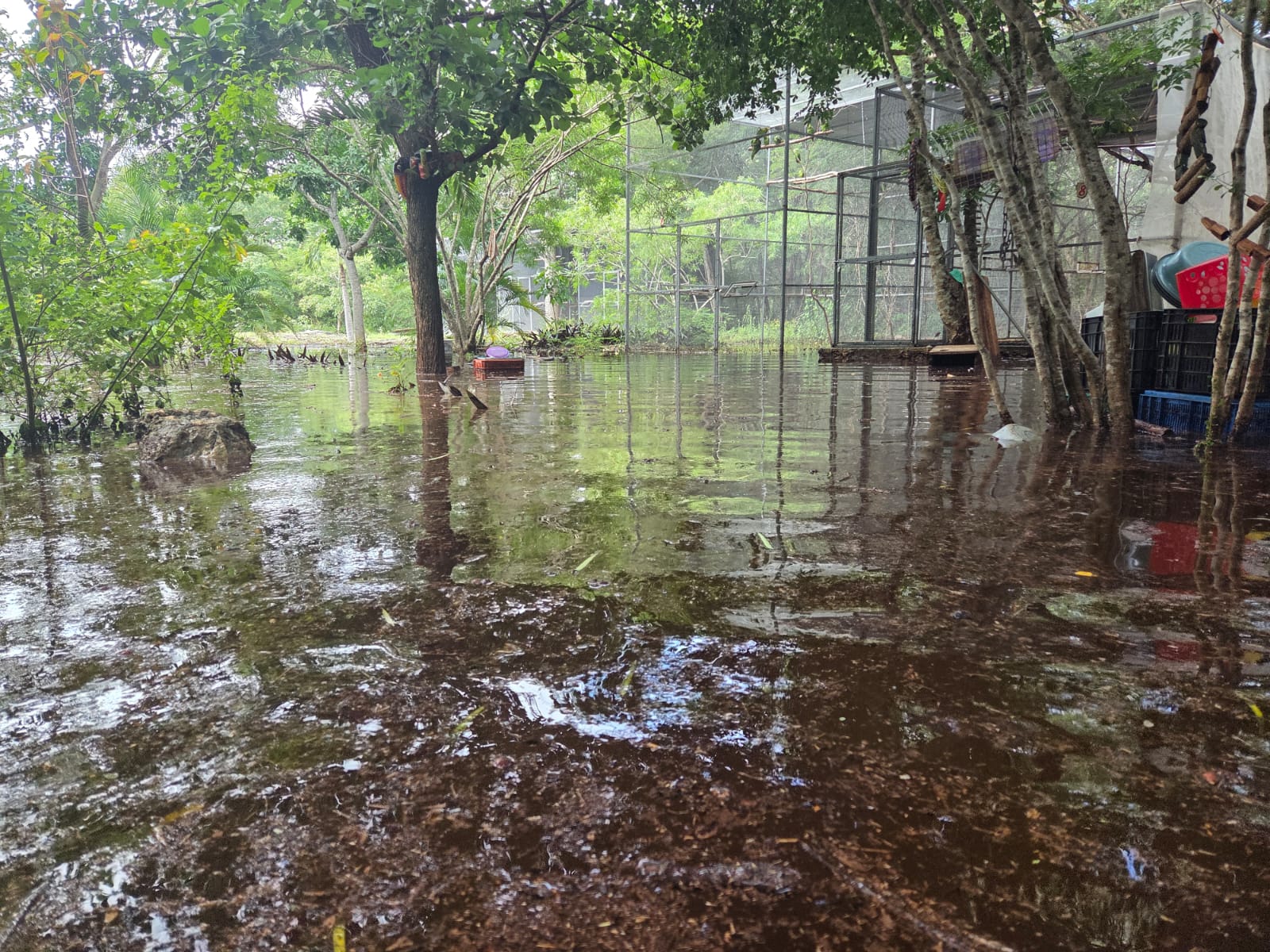 Hunucmá, a 21 de septiembre de 2025.- Debido a las fuertes precipitaciones que se han registrado en la entidad, el refugio de loros de Proyecto Santa María que completamente inundado.