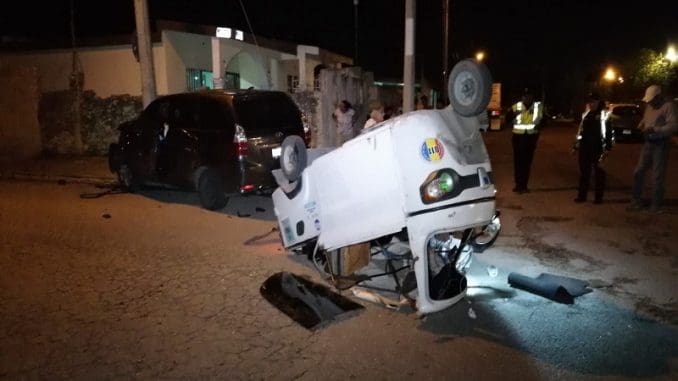 Mérida, Yucatán, 10 de julio del 2023.-El conductor de una camioneta Toyota Avanza, que circulaba sobre la calle 62 de la colonia San José Tecoh termino por impactar a un mototaxi que circulaba sobre la calle 151, con sobre cupo de pasajeros.