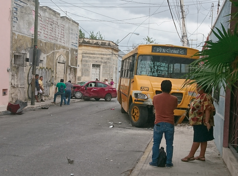 Mérida, Yucatán, 8 de marzo de 2018.- Tres personas lesionadas fue el saldo de un accidente de tránsito ocurrido esta mañana en las calles del Centro Histórico de Mérida, luego de que un auto particular fuera impactado por una unidad de transporte público.