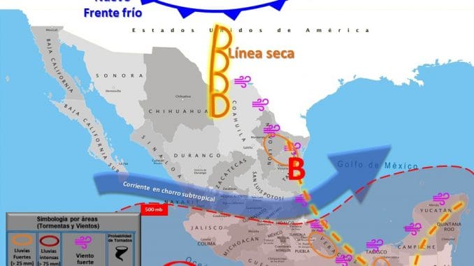 Lo anterior debido a una vaguada inducida por el frente frío No. 62, que en combinación con aire cálido y húmedo incrementará el potencial de lluvias y tormentas eléctricas en la región, las cuales estarán acompañadas de vientos fuertes y no se descartan algunas granizadas de forma aislada.