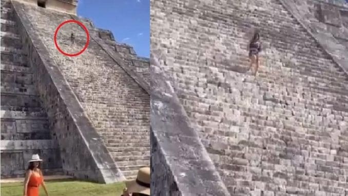 Una mujer de orígen español burló la vigilancia y subió hasta lo alto del castillo principal donde hasta bailó, al bajar la gente la increpó y hasta la custodió para retirarla del lugar en medio de empujones e insultos. Le apodaron en redes sociales «Lady Chichén Itzá».