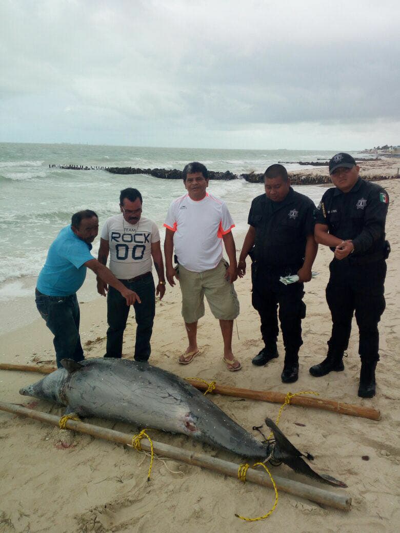 Progreso, Yucatán, 29 de enero de 2018.- Tremenda sorpresa se llevaron pobladores y visitantes en Puerto Progreso al percatarse de que en la playa se encontraba el cadáver de un delfín en estado de descomposición.