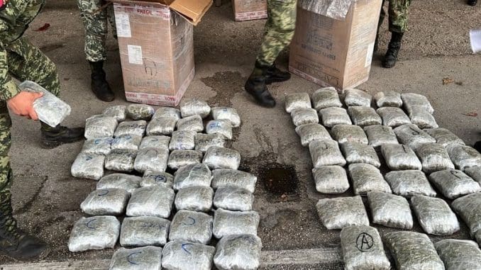 Mérida, Yucatán, 30 de noviembre del 2022.-Fueron detenidas dos personas que conducían un camión de mudanza por soldados de la X Región Militar debido a que transportaban 680 kilos con 500 gramos de mariguana; esto en el paradero turístico de Halacho.