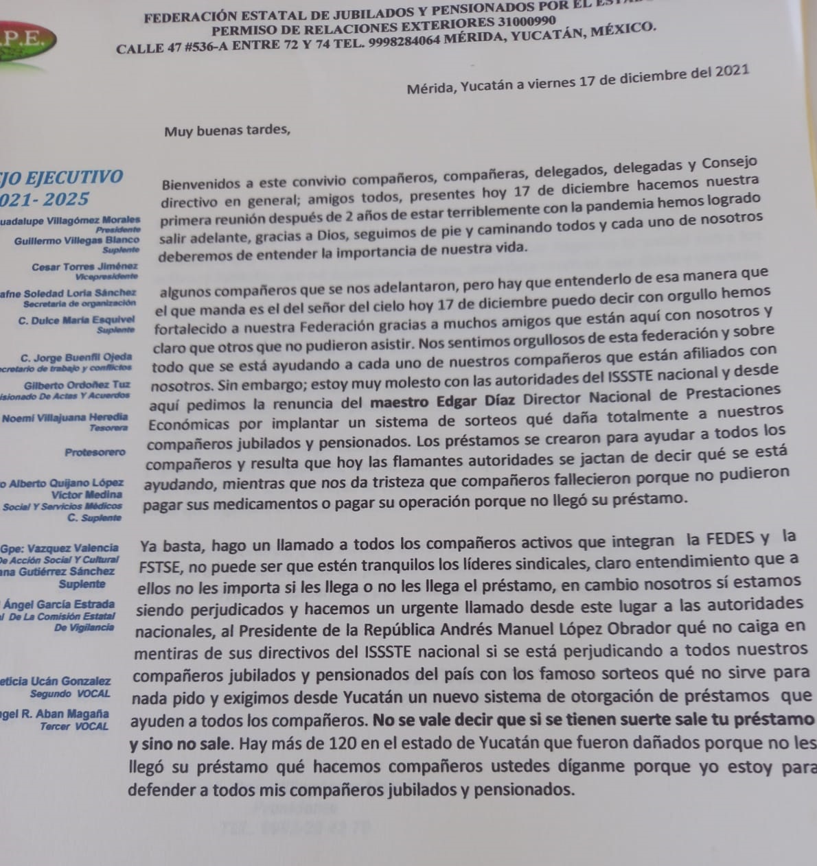 Mérida, Yucatán, 18 de diciembre del 2021.- Numerosos trabajadores con la categoría de jubilados y pensionados del Issste se quejan sobre la ocurrencia de las autoridades nacionales de esta institución de sortear los préstamos, donde curiosamente los primeros que se inscriben nunca les toca.