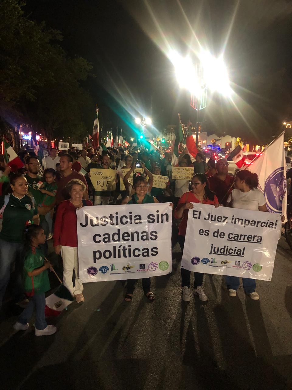Vestidos con los colores de la Patria, los manifestantes avanzaron por la principal avenida de Mérida en una protesta que expresaba su inconformidad con la reforma que propone el voto de ministros, jueces y magistrados.