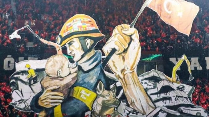 La afición del equipo Trabzonspor desplegó un tifo (imagen de gran superficie) con el retrato de un rescatista cargando a un bebé, de Proteo y las banderas de Suiza, Portugal, Japón, Malasia, Francia, Albania y Bosnia, por mencionar algunos, países que han enviado ayuda tras los terremotos que suman más de 36 mil muertos tan solo en Turquía.