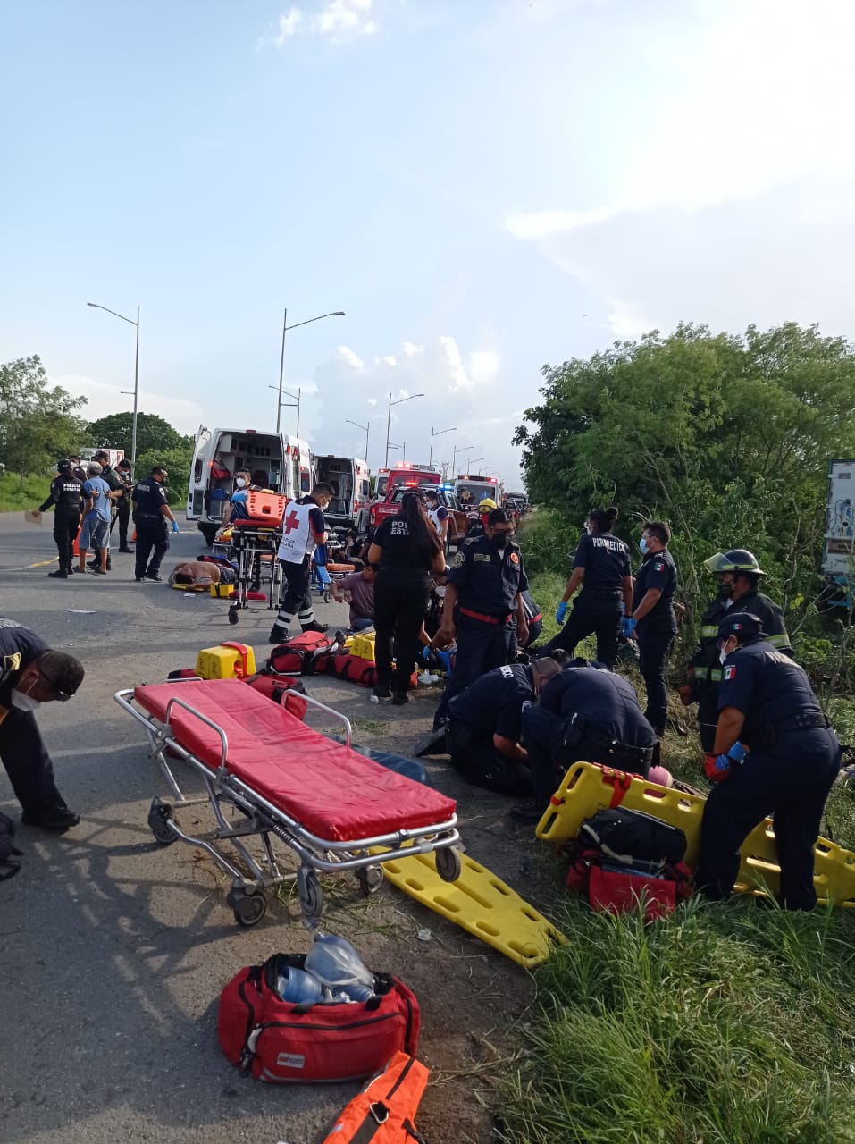 Unidades de la SSP, ambulancia de la Cruz Roja, y hasta bomberos se dieron cita en el lugar de los hechos, cerca del puente de Xmatkuil sobre periférico, para atender a los lesionados. Así también llegó el Servicio Médico Forense para el levantamiento de los cuerpos.