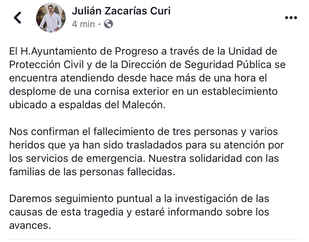 Progreso, Yucatán, 17 de febrero de 2019.- Este domingo se derrumbó la marquesina del restaurante bar Mocambo, ubicado en la calle 58 con 21 del centro de Progreso. Informan que hasta el momento hay varios lesionados y 3 personas fallecidas, incluida una menor de aproximadamente cinco años.