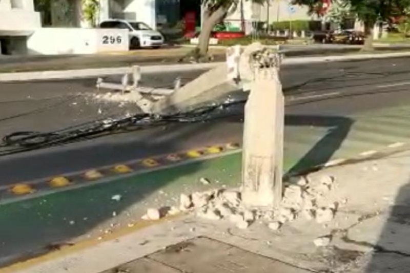 Mérida, Yucatán, a 3 de diciembre de 2021.- Esta madrugada varias zonas del norte de la ciudad, domicilios y comercios, se quedaron sin energía eléctrica, luego de que camión de carga se enredara en cables que sostenían varios postes, los cuales al final fueron derribados; los hechos ocurrieron en Prolongación Paseo de Montejo, en el área de agencias de autos.