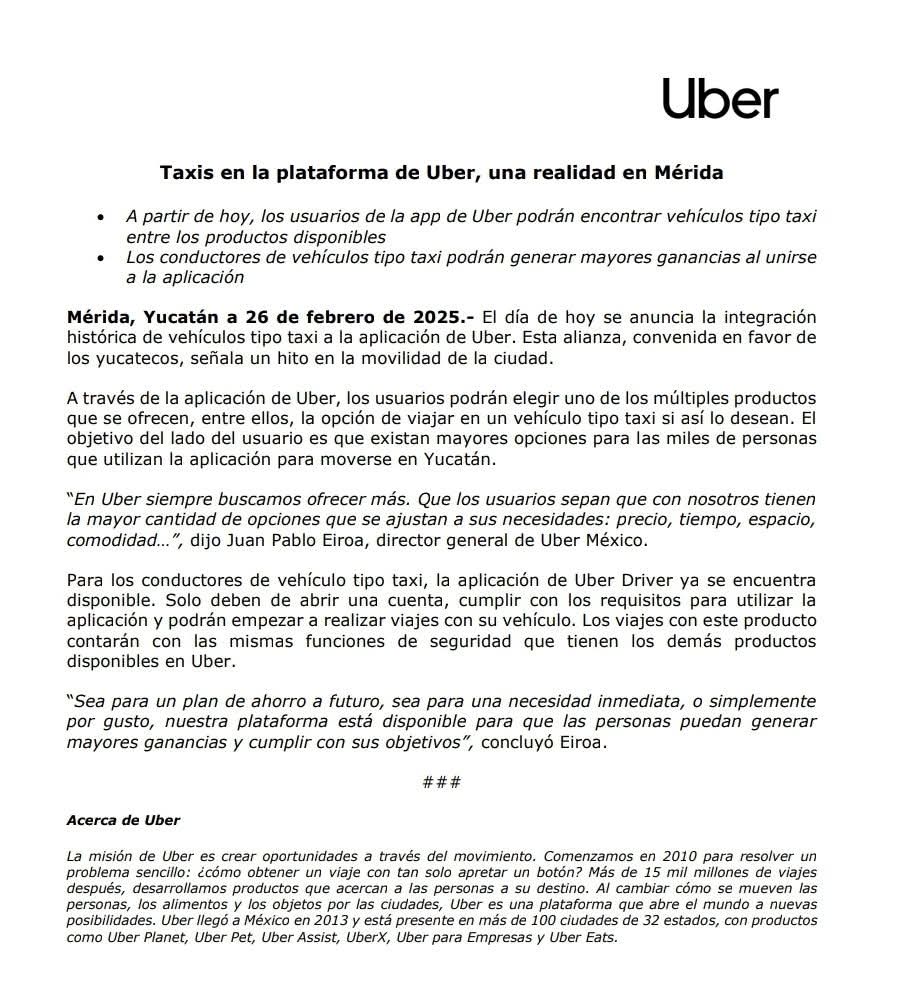 Mérida, a 26 de febrero del 2025.- Desde hoy, los usuarios de Uber en Mérida podrán viajar en taxis, gracias a una alianza histórica entre la plataforma y los conductores de asociación yucatecas.