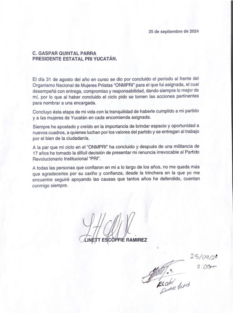 Mediante una carta que hace llegar al presidente del PRI yucateco, Gaspar Quintal Parra, explica que el 31 de agosto terminó su periodo frente al ONMPRI, la cual fue asignada y se despeñó hasta la fecha mencionada: Con entrega, compromiso y responsabilidad, dando siempre lo mejor de mí, por lo que al haber concluido el ciclo pido se tomen las acciones pertinentes para nombrar a una encargada.