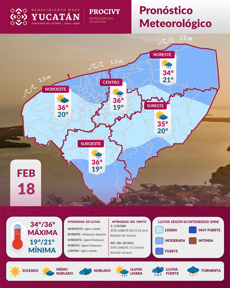 Mérida, a 18 de febrero de 2025.- Este martes continuará el clima caluroso en Yucatán debido a un canal de baja presión en el Golfo de México y al ingreso de humedad del océano Pacífico y Mar Caribe.