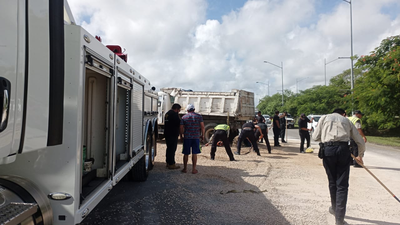 Volquete deja material de construcción en el Periférico de Mérida