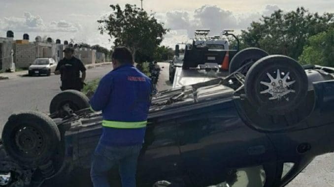 Mérida, Yucatán, 2 de enero del 2023.-El conductor de un Chevy, con placas de Campeche, se volcó y el conductor dejó abandonado el vehículo.