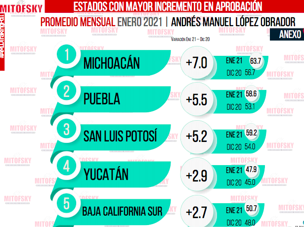 Según el estudio, en los últimos dos meses, la opinión a favor del mandatario federal creció un 2.9%, pues en noviembre del año pasado únicamente el 45.0% de las y los encuestados se manifestó a favor. Esto coloca al Estado en la posición número 4, con más crecimiento, solo detrás de Michoacán (+7.0%), Puebla (+5.5%) y San Luis Potosí (+5.2%).