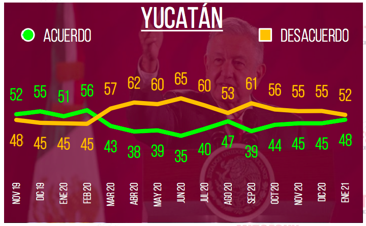 Mérida, Yucatán, 06 de febrero de 2021.– De acuerdo a Consulta Mitofsky, empresa especializada en análisis y recolección de información en México, un 47.9 por ciento de las y los yucatecos aprueban el trabajo del presidente Andrés Manuel López Obrador, sin embargo, Yucatán se ubica entre las últimas 6 entidades con menor apoyo del país.