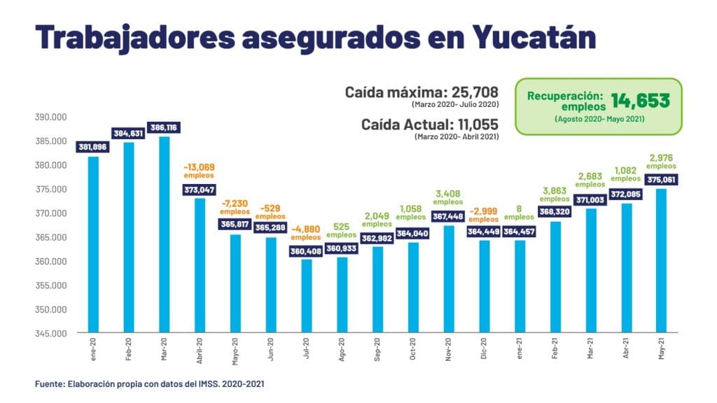 Mérida, Yucatán, 14 de junio de 2021.- Durante los últimos 10 meses, de agosto de 2020 a mayo de 2021, en Yucatán se han recuperado un total de 14,653 empleos de los más de 25,000 que se perdieron a causa del impacto económico por la pandemia del Coronavirus, es decir, se han recuperado 6 de cada 10 de los empleos perdidos, lo que es resultado del trabajo constante del Gobernador Mauricio Vila Dosal para atraer más inversiones y las ventajas competitivas que ofrece el estado.