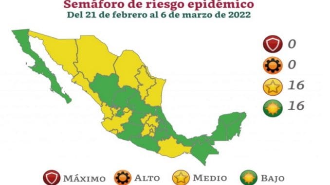 Por primera vez en semanas el semáforo de riesgo epidémico no tendrá ningún estado en color naranja ni rojo. En total, son 16 los estados en color verde en el semáforo de riesgo epidémico por Covid-19 y 16, los estados en amarillo.