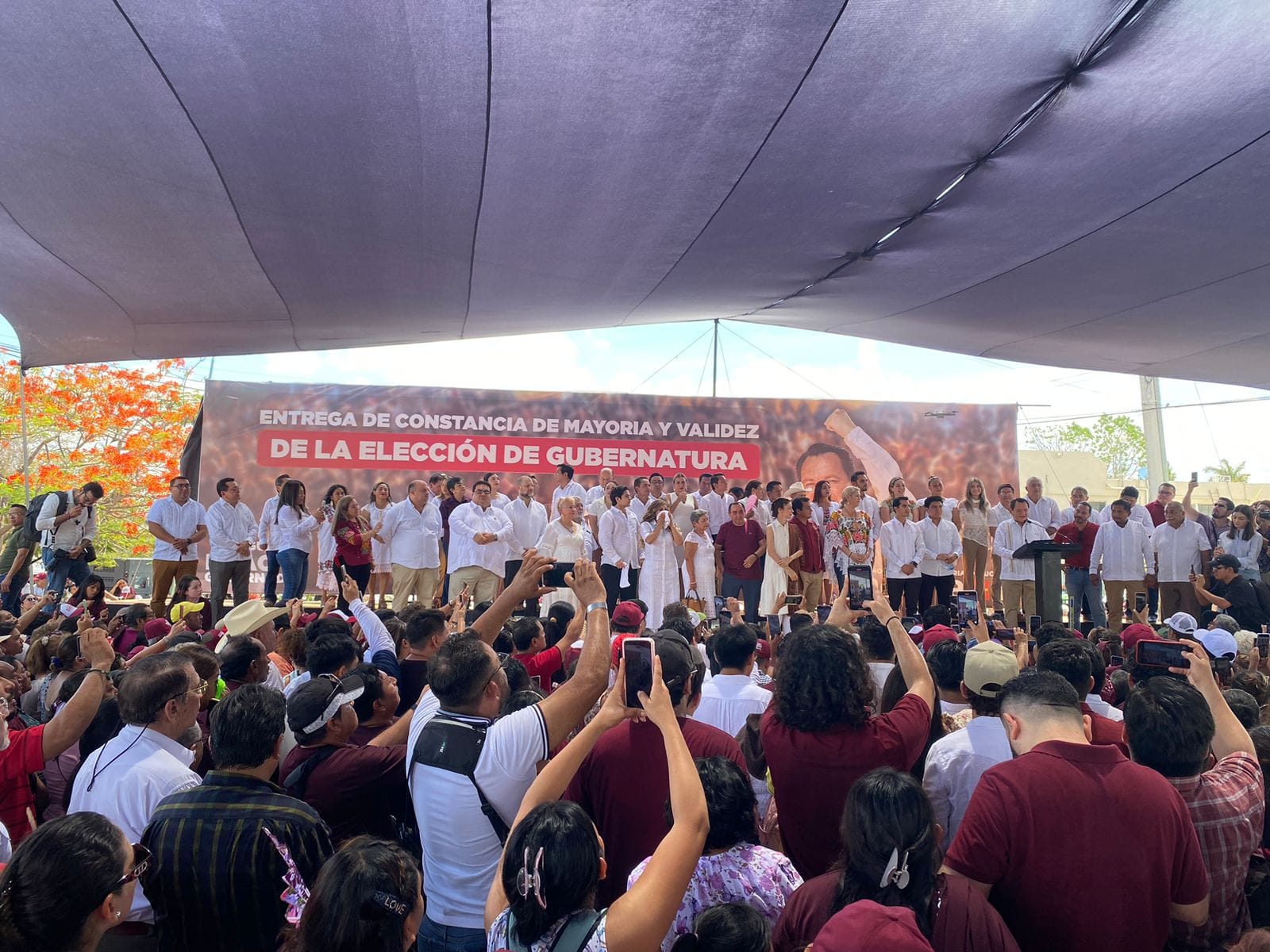 “Hoy es día histórico para Yucatán porque el proyecto de la Cuarta Transformación porque recibimos la constancia de mayoría», afirmó Huacho ante sus simpatizantes reunidos a las puertas del Iepac.