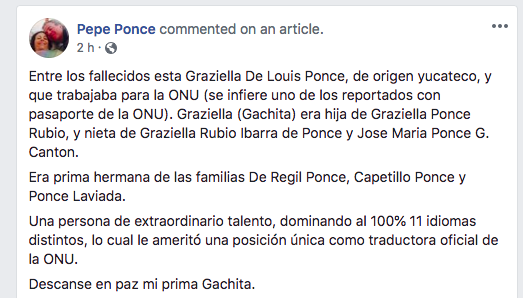 El señor Pepe Ponce, primo de la víctima, publicó a través de su cuenta de Facebook la situación por la que atraviesa la familia, y señaló que la joven era hija de Graziella Ponce Rubio.