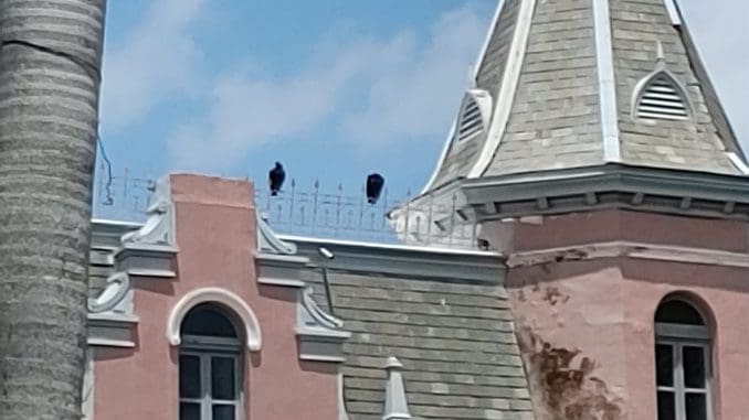 Un par de zopilotes se posa en un barandal de la famosa casa El Pinar, ubicada en la calle 60 con Pérez Ponce, mansión que se asemeja a un castillo medieval y que sigue causando curiosidad entre turistas y yucatecos.